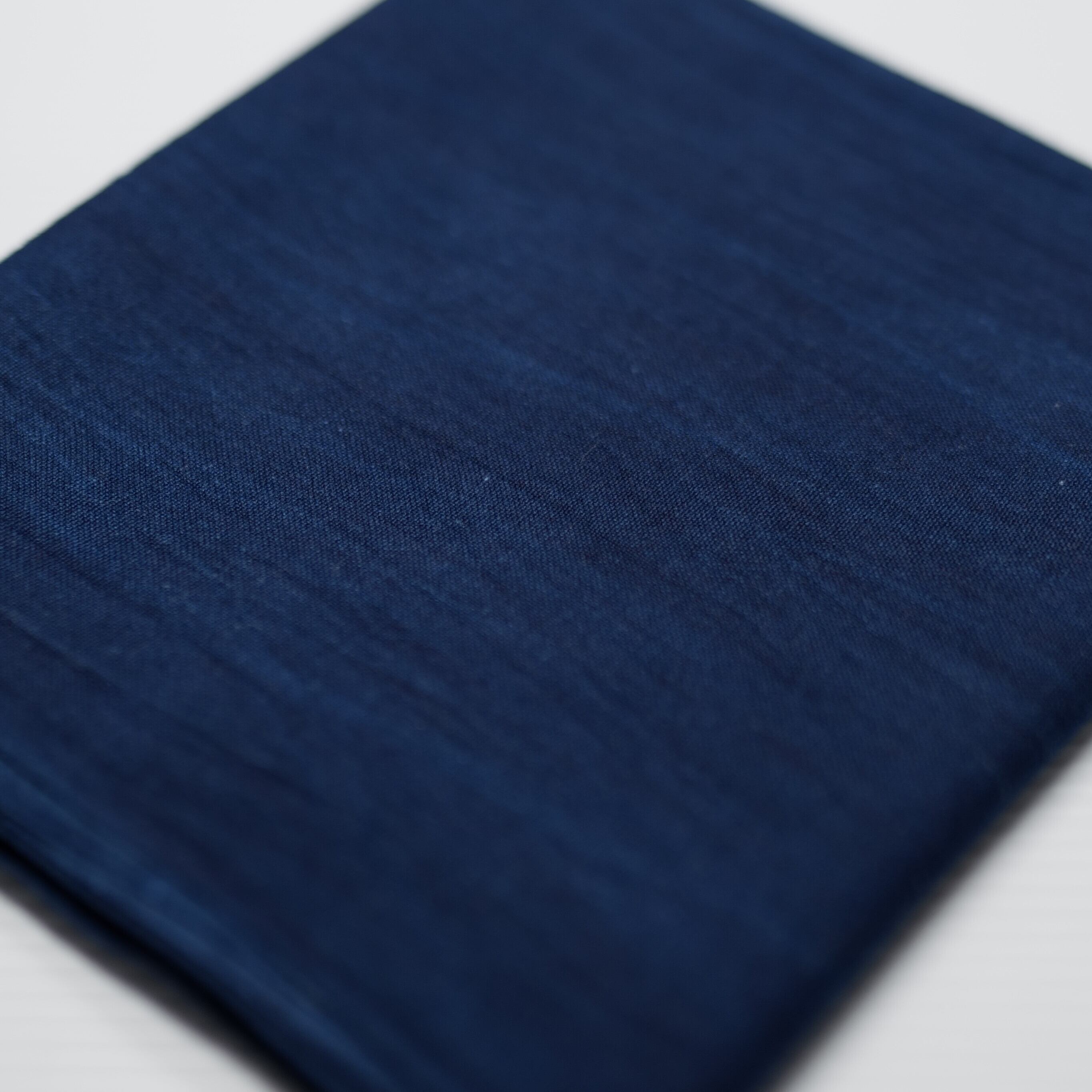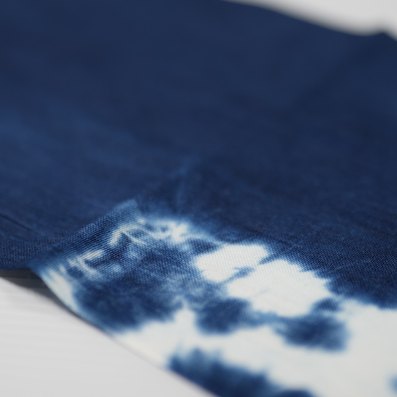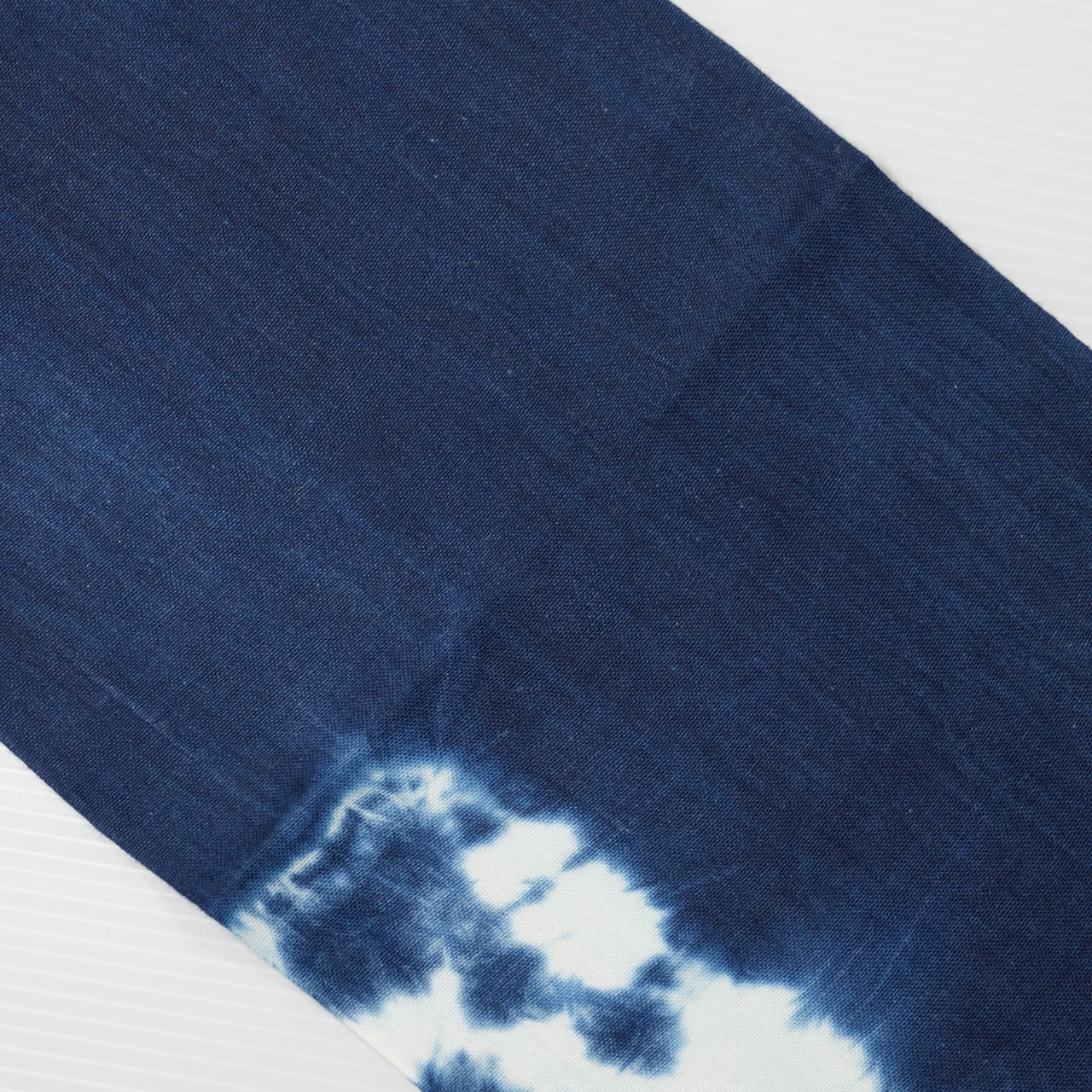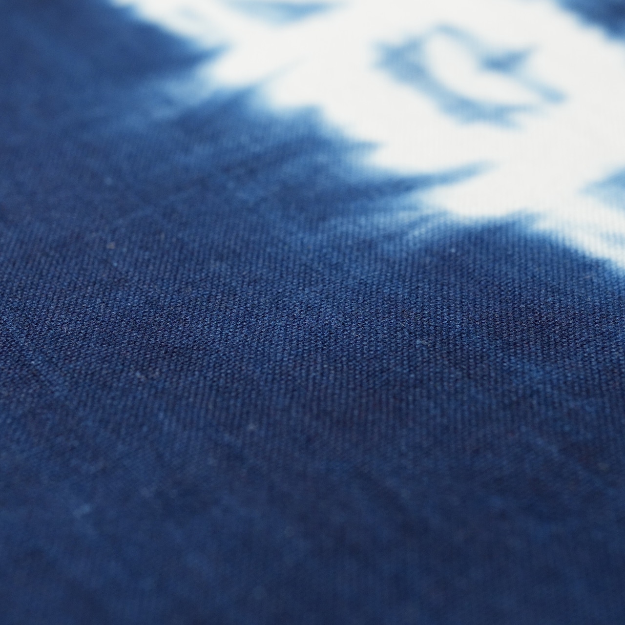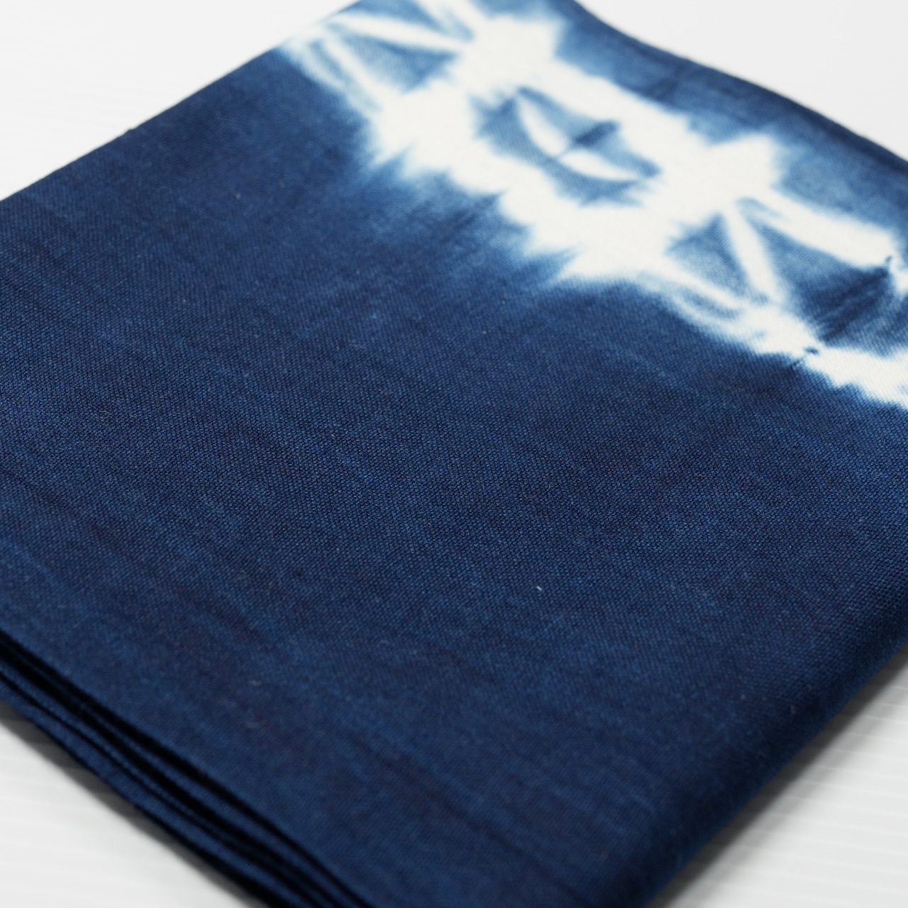 片側は絞り染めによる閃光のような白地、反対側は深みある無地藍。